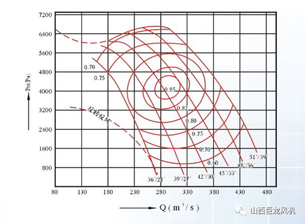 矿用短轴主扇风机采用的是跟欧美同步的流体力学技术,采用国际领先的三元流设计叶型,一对一量体裁衣式设计,风机高效范围宽广,效率点可以达到89%,80%的高效区域可占风机性能有效范围(风机性能的有效范围为风机性能曲线的60%左右)的45%左右,特别适用于矿井通风容易时期与困难时期的大跨度需求。