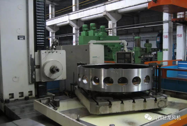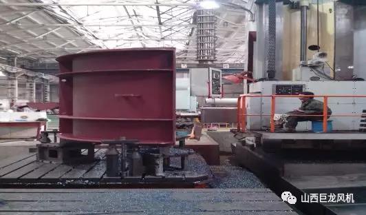 机壳焊接完成后整体退火,经过大型龙门刨床、大型立车等设备加工而成,确保了机壳的加工精度达到设计要求;使叶片与机壳的间隙符合设计要求,有利于风机风量、风压及效率的提高。