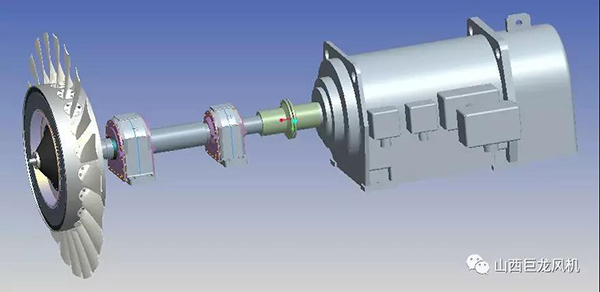 矿用短轴主扇风机的叶轮安装在传动组的主传动轴上,配套轴承按叶轮运转所产生的径向和轴向载荷进行合理配置,满足风机长期安全运行需求;电机主轴及轴承只承担因扭矩驱动和自身转子重量产生的载荷,而不再额外承载其他负载(电机设计规范,明确电机轴不得承受径向和轴向载荷),为保证电机在设计寿命范围内安全运行提供了条件。